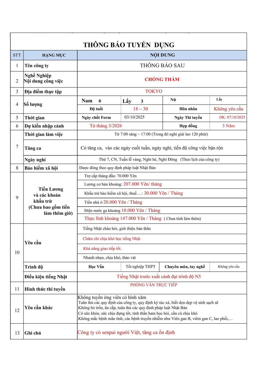 Đơn hàng chống thấm tại Tokyo là cơ hội phù hợp cho các bạn nam trẻ tuổi, có thể lực tốt, mong muốn sang Nhật làm việc với mức lương cao, nhiều giờ tăng ca và được đào tạo bài bản trong môi trường chuyên nghiệp.