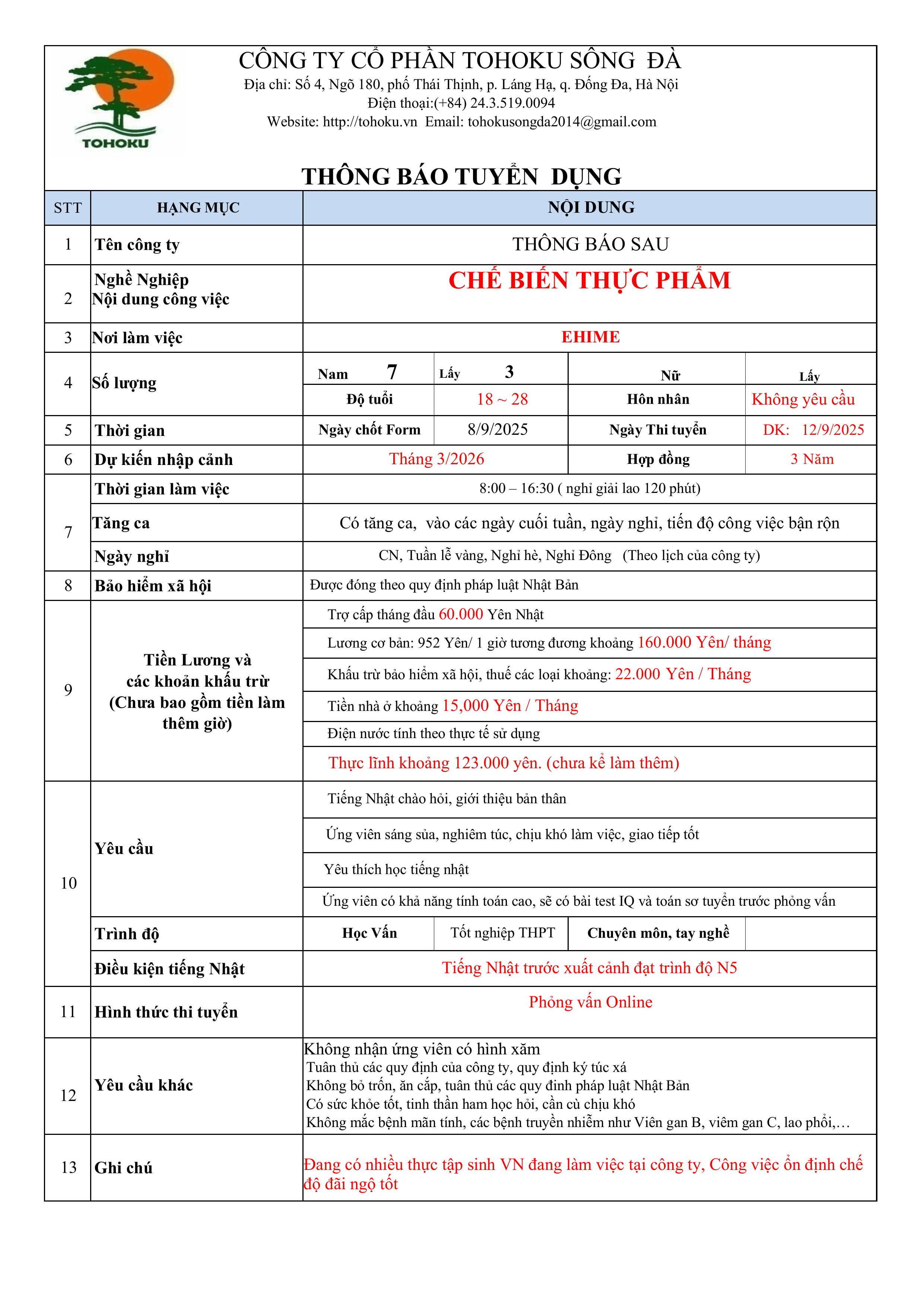 THÔNG BÁO TUYỂN DỤNG: CHẾ BIẾN THỰC PHẨM (NỮ)-EHIME