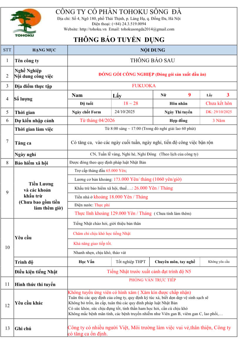 Công ty cổ phần Tohoku Sông Đà xin được thông báo đơn hàng Đóng gói công nghiệp (Nữ) tại Fukuoka thông tin chi tiết như sau: