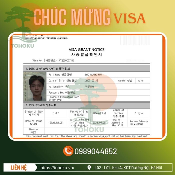 Chúc mừng em Đào Quang Huy (sinh năm 2007) đã chính thức nhận được visa du học Hàn Quốc – một cột mốc quan trọng đánh dấu sự trưởng thành và nỗ lực không ngừng của em trong suốt thời gian qua.