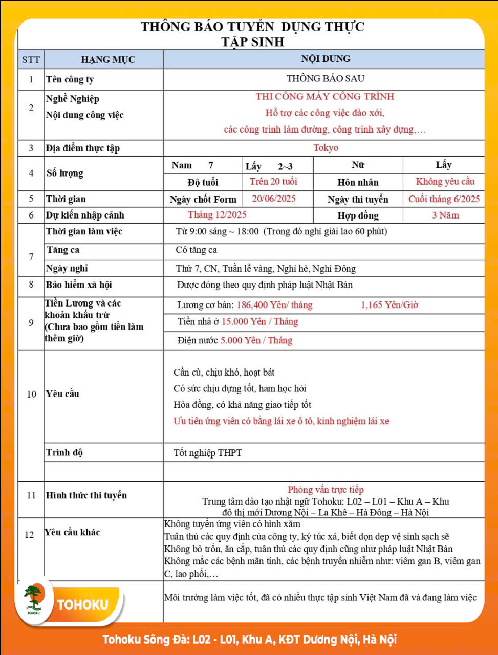 TUYỂN DỤNG ĐƠN HÀNG: THI CÔNG MÁY CÔNG TRÌNH (NAM)- TOKYO