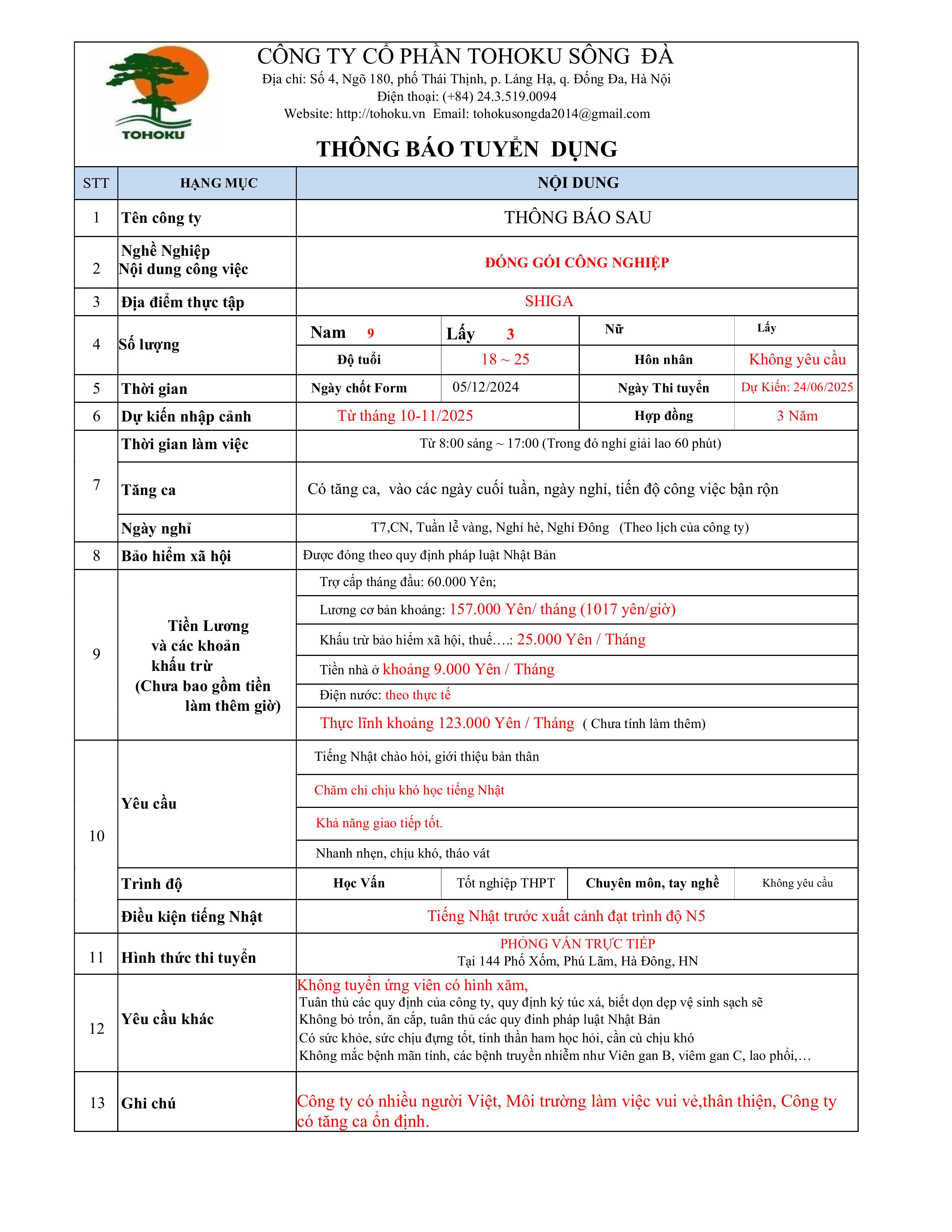 TUYỂN DỤNG ĐƠN HÀNG: ĐÓNG GÓI CÔNG NGHIỆP (NAM)- SHIGA