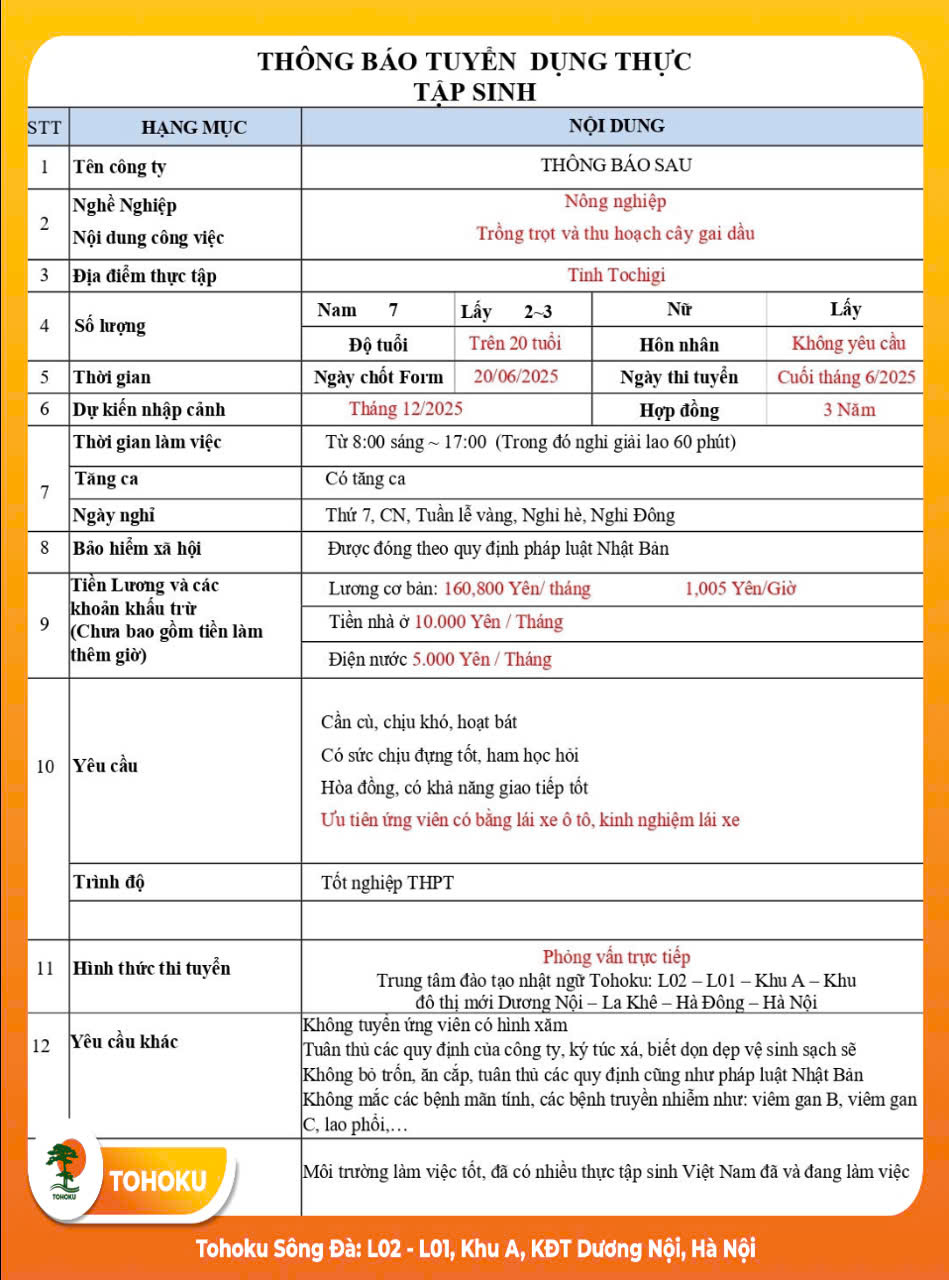 TUYỂN DỤNG ĐƠN HÀNG : NÔNG NGHIỆP (NAM)- TOCHIGI
