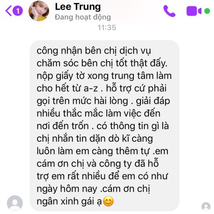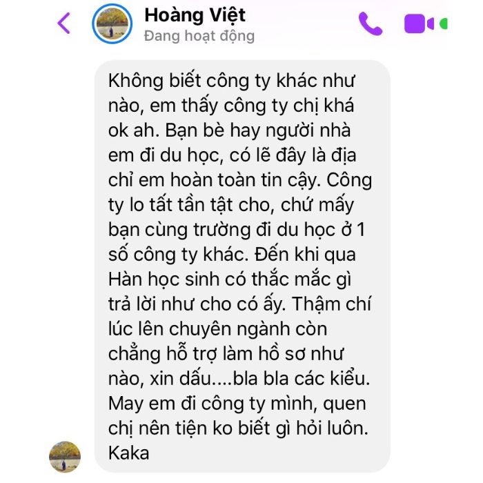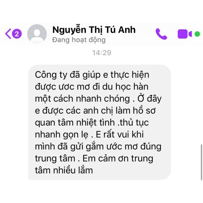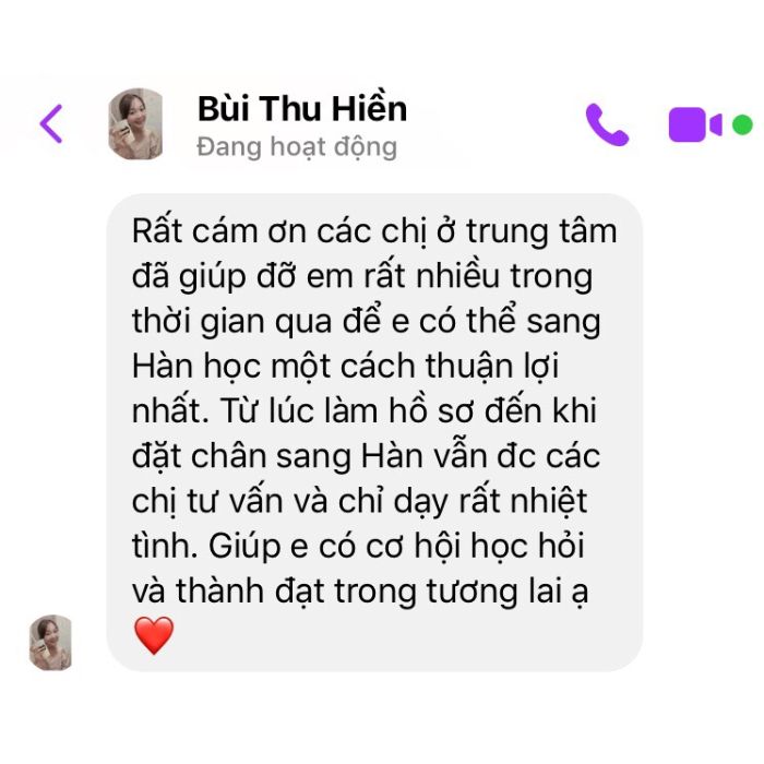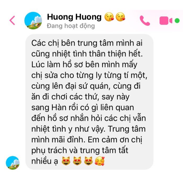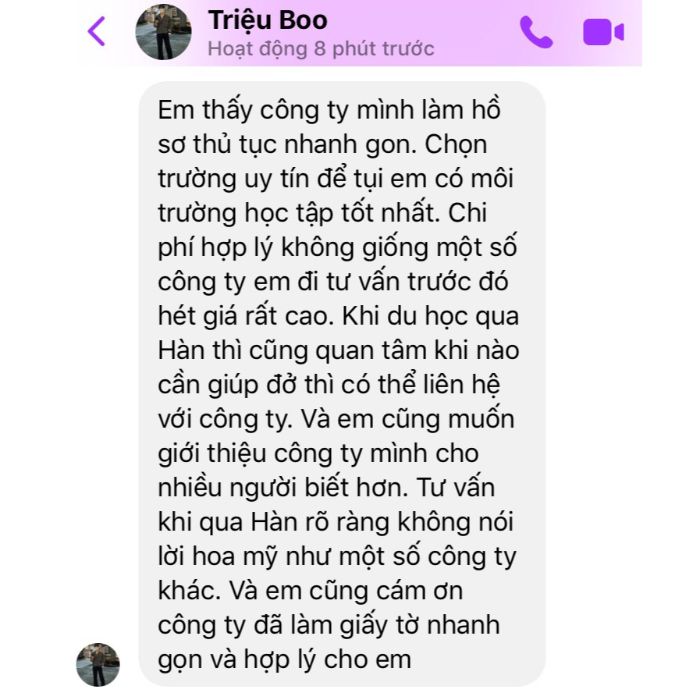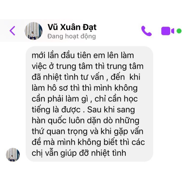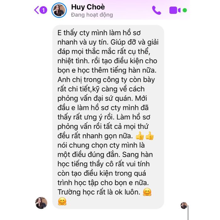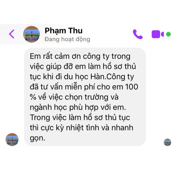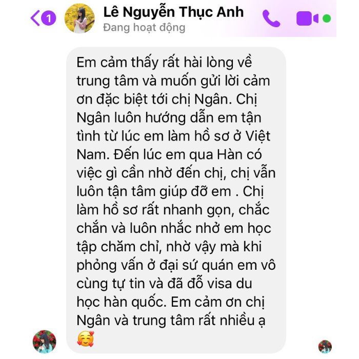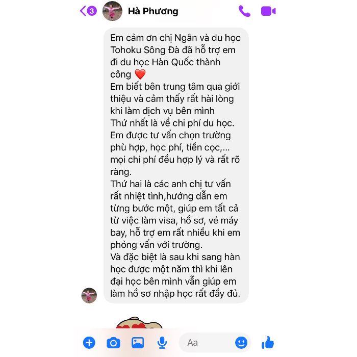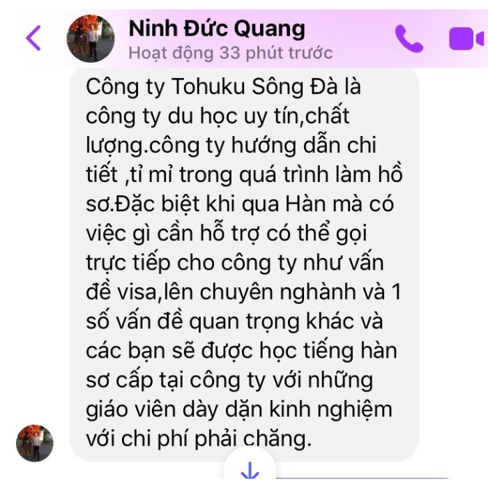 Dưới đây là một số review nhận xét của Các bạn du học sinh hiện đang học tập tại Hàn Quốc về dịch vụ làm hồ sơ xin visa tại Công ty Tohoku Sông Đà. Công ty xin cảm ơn các bạn đã tin tưởng và lựa chọn Công ty là nơi kết nối cho các bạn đến được đất nước mơ ước của mình. Công ty cam kết và luôn sẵn sàng hỗ trợ 100% trong suốt quá trình các bạn học tập và làm việc tại Hàn Quốc.