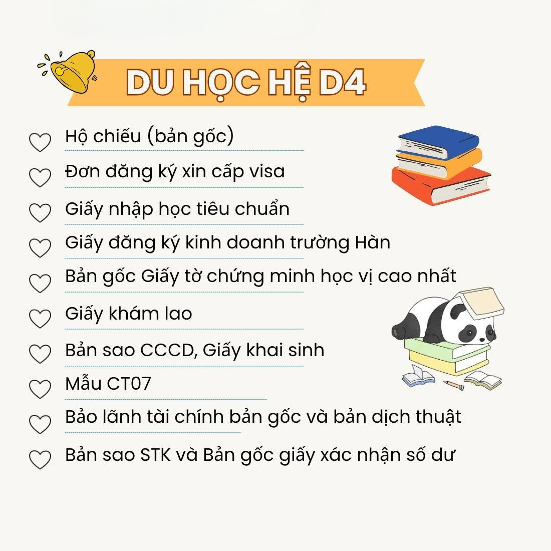 Đối với những bạn theo học chương trình du học tiếng (D4) tại các trường ngôn ngữ ở Hàn Quốc, cần chuẩn bị những giấy tờ sau.