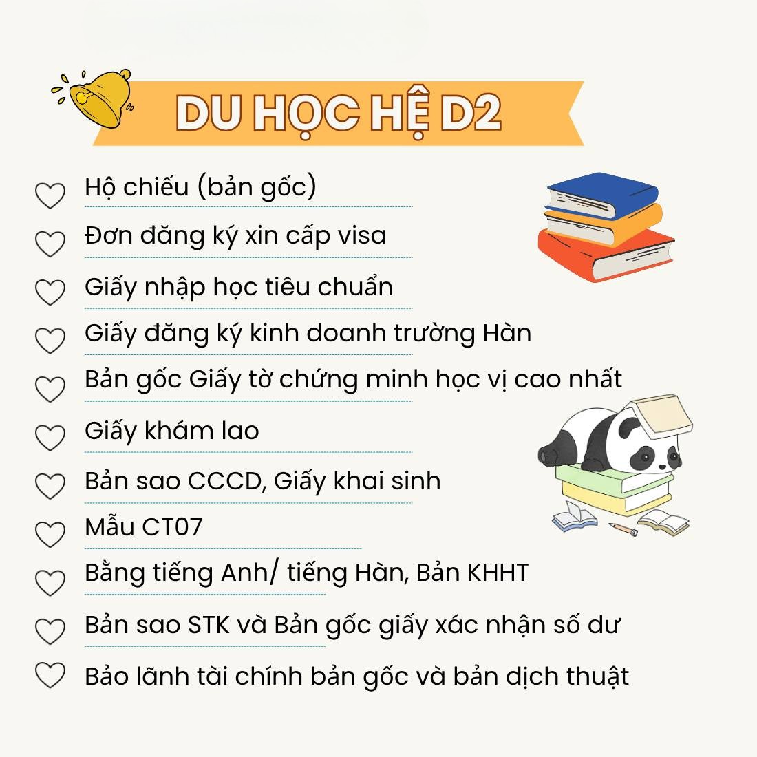 | D2 | Du học hệ chính quy: Cao đẳng, Đại học, Thạc sĩ, Tiến sĩ | Người có TOPIK, đã tốt nghiệp THPT hoặc Đại học |