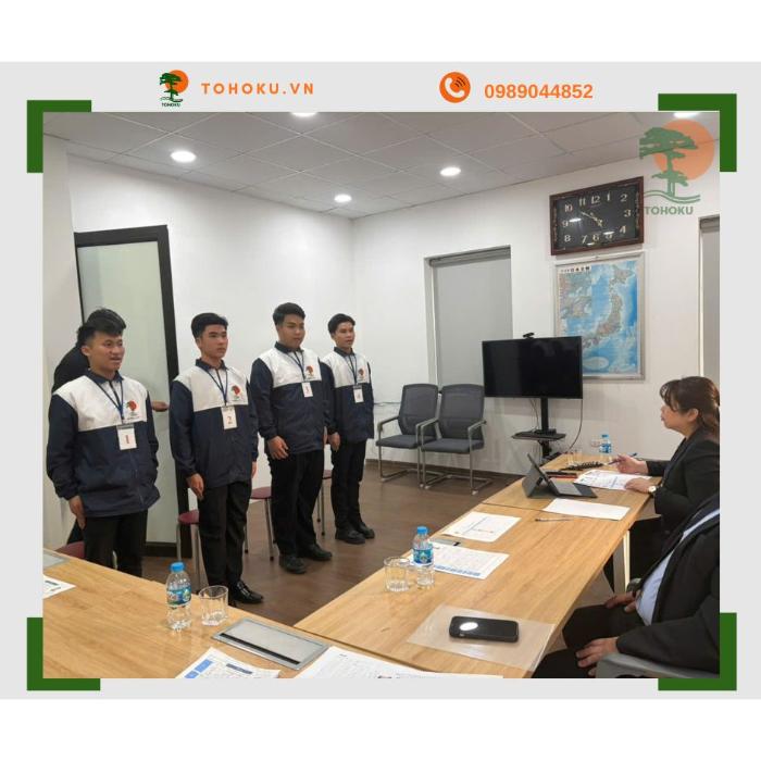 Buổi phỏng vấn kéo dài khoảng 2,5 tiếng, gồm chào hỏi – giới thiệu bản thân bằng tiếng Nhật, giao lưu trực tiếp với Bác Giám đốc xí nghiệp và bài test thể lực (chống đẩy). Không khí diễn ra cởi mở, thân thiện, để lại nhiều ấn tượng tích cực cho cả hai bên.