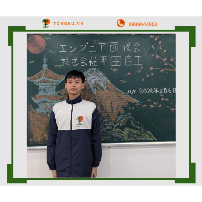 TOHOKU chúc mừng Lê Văn Thành Vinh – sinh năm 2006, quê Hà Tĩnh, đã chính thức trúng tuyển vị trí Kỹ sư Bảo dưỡng ô tô tại Công ty Cổ phần Hirata Jiko (Nhật Bản).