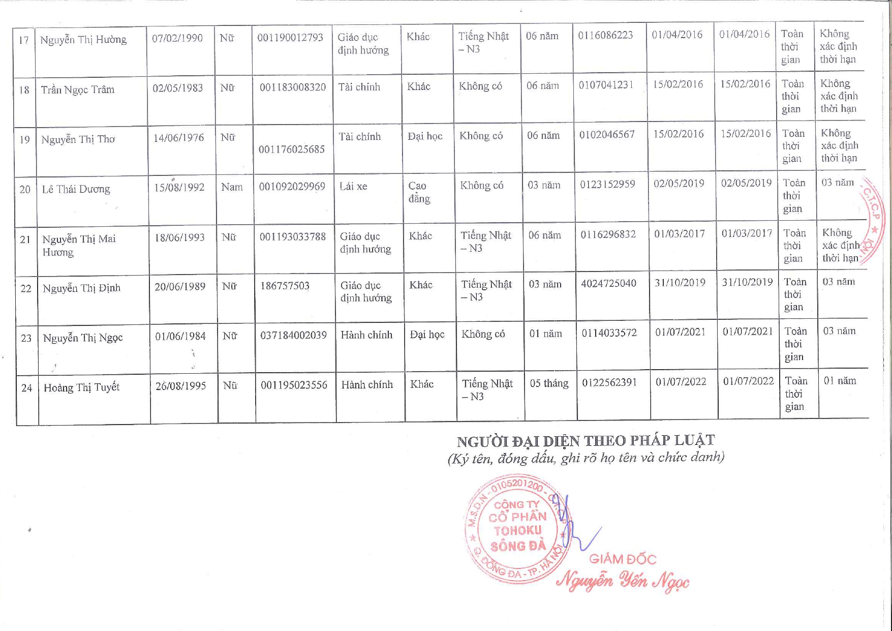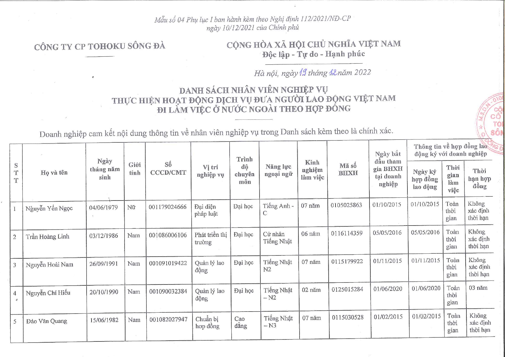 DANH SÁCH NHÂN VIÊN NGHIỆP VỤ THỰC HIỆN HOẠT ĐỘNG DỊCH VỤ ĐƯA NGƯỜI LAO ĐỘNG VIỆT NAM ĐI LÀM VIỆC Ở NƯỚC NGOÀI THEO HỢP ĐỒNG CỦA CÔNG TY CỔ PHẦN TOHOKU SÔNG ĐÀ