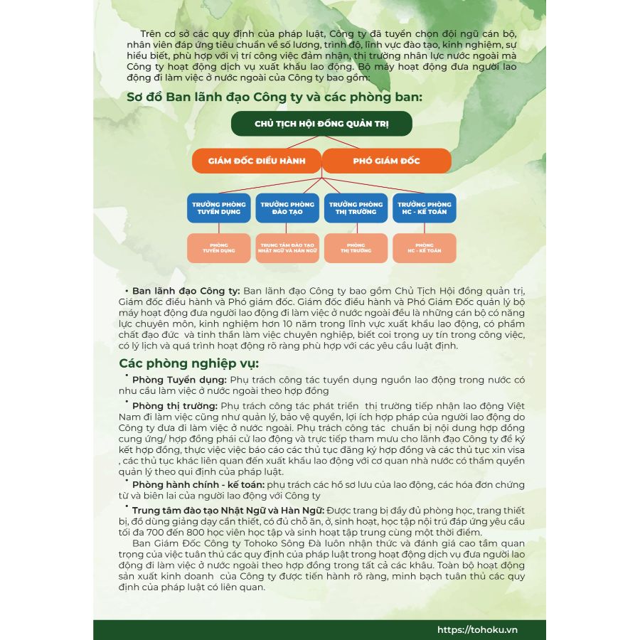Công ty Cổ phần Tohoku Sông Đà được thành lập từ ngày 18 tháng 03 năm 2011, Mã số doanh nghiệp: 0105201200, đã được Bộ lao động- Thương binh và Xã hội cấp giấy phép hoạt động dịch vụ được người lao động đi làm việc ở nước ngoài vào ngày 21 tháng 04 năm 2015. Ngay từ khi hoạt động dịch vụ xuất khẩu lao động, Công ty đã hướng tới chính sách kinh doanh “Đặt lợi ích của người lao động lên hàng đầu” coi đây là kim chỉ nam trong việc xây dựng quy định, quy định triển khai để đảm bảo hiệu quả và thành công cao nhất trong hoạt động dịch vụ.