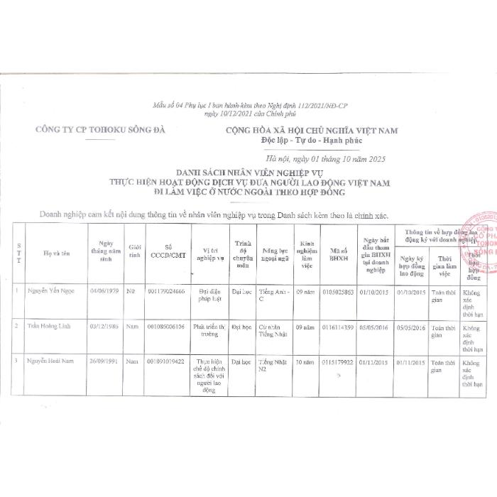 Danh sách Nhân viện nghiệp vụ thực hiện hoạt động dịch vụ đưa người lao động Việt Nam đi làm việc ở nước ngoài theo hợp đồng cập nhật 03/10/2025.