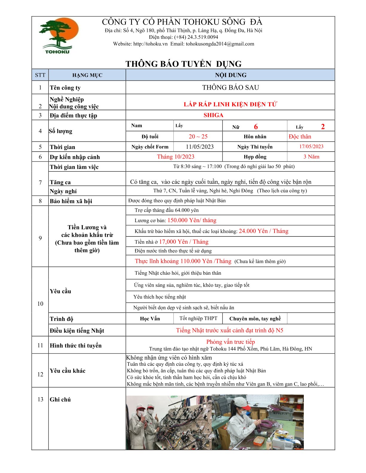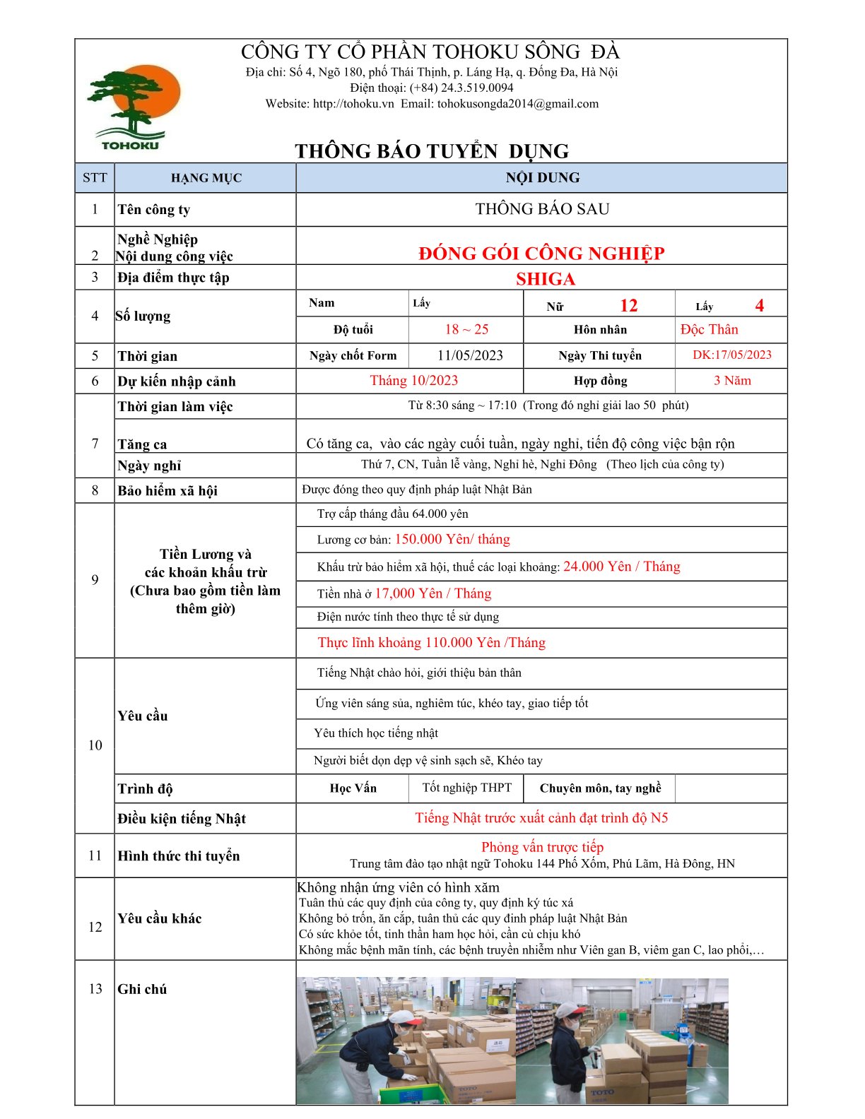 CHUẨN BỊ DANH SÁCH ỨNG VIÊN CHO CÁC ĐƠN HÀNG NAM, NỮ TRONG THÁNG 5/2023. Đặc biệt, vui mừng chào đón các đối tác Nhật bản mới đã tin tưởng TOHOKU chọn làm đơn vị tuyển dụng,