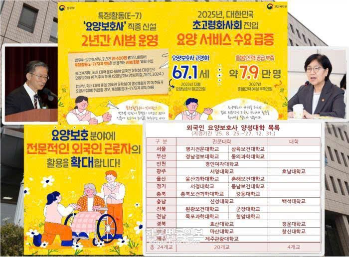 Bộ Tư pháp (Bộ trưởng Jeong Seong-ho) và Bộ Y tế & Phúc lợi (Bộ trưởng Jeong Eun-kyung) đã công bố kết quả cuối cùng về việc lựa chọn các trường đại học được chỉ định đào tạo điều dưỡng viên chăm sóc người cao tuổi cho người nước ngoài nhằm giải quyết tình trạng thiếu hụt nhân lực chăm sóc trong nước.