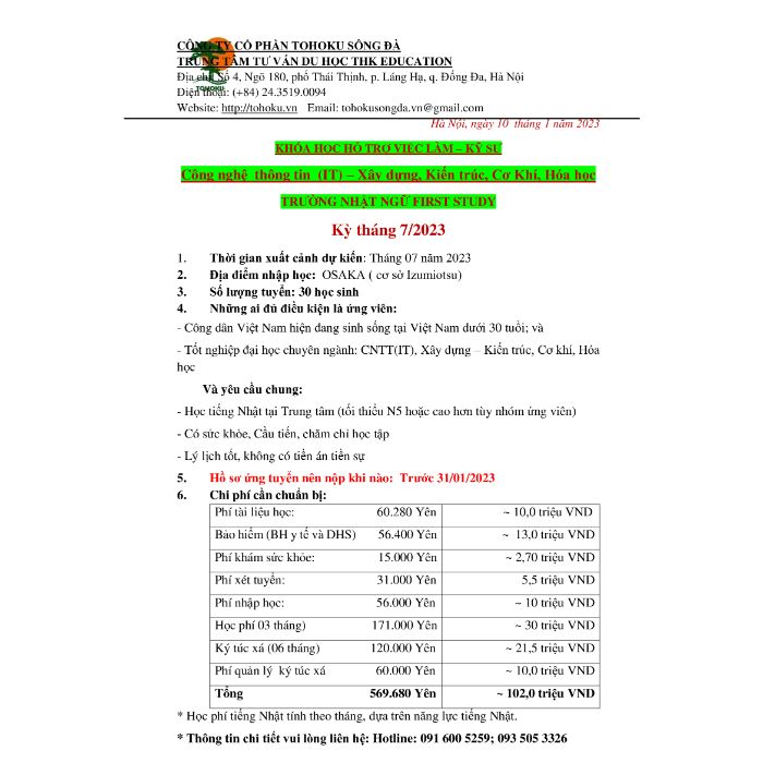 Trường Nhật ngữ First study mở khóa học hỗ trợ tìm việc làm cho Kỹ sư các chuyên ngành Công nghệ thông tin (IT), Xây dựng - kiến trúc, Cơ khí, Hóa học.