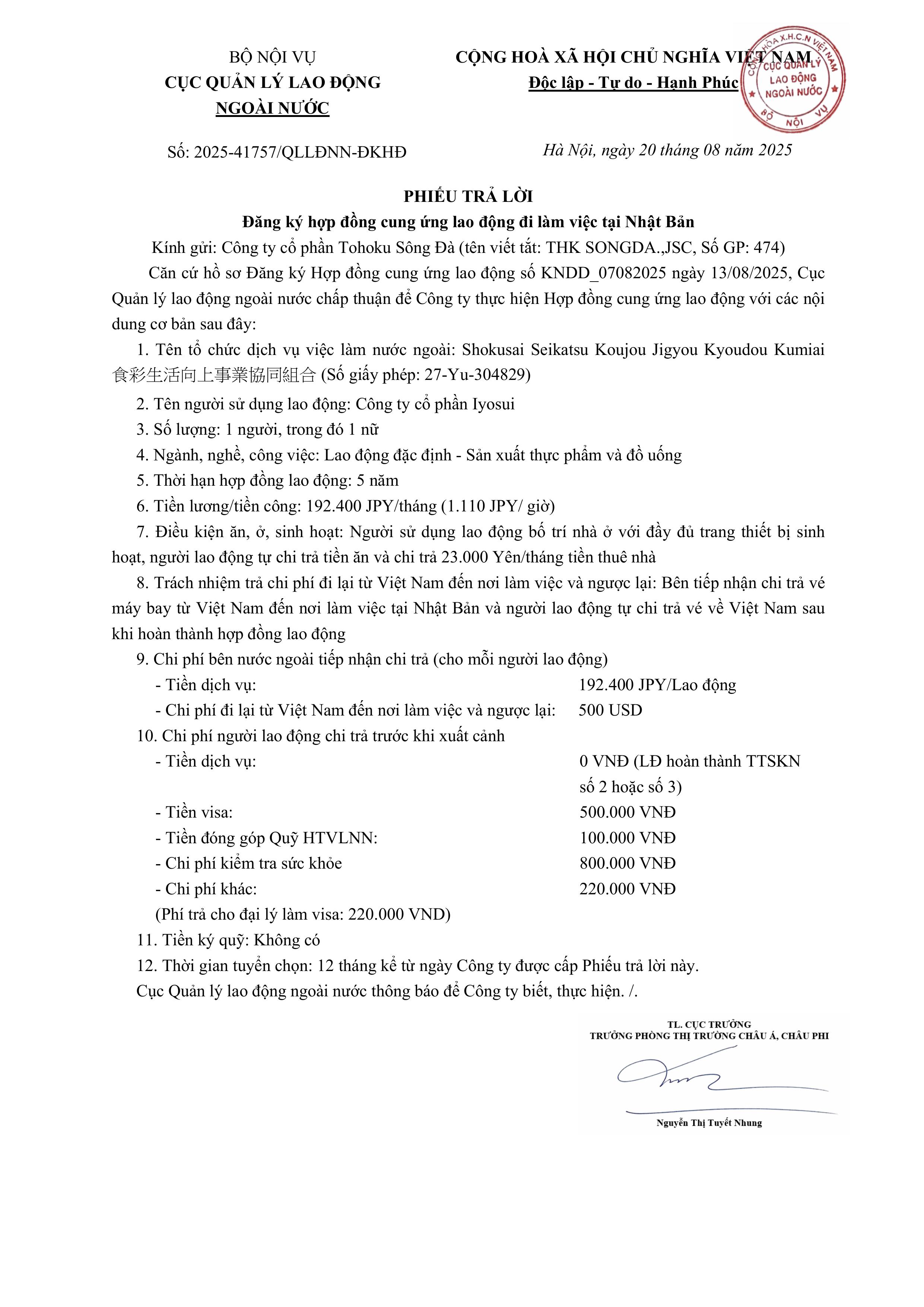 HỢP ĐỒNG ĐƯỢC CỤC QUẢN LÝ LAO ĐỘNG NGOÀI NƯỚC CHẤP THUẬN THÁNG 08/2025 Người đăng: Công ty cổ phần Tohoku Sông Đà - 16/09/2025 HỢP ĐỒNG ĐƯỢC CỤC QUẢN LÝ LAO ĐỘNG NGOÀI NƯỚC CHẤP THUẬN THÁNG 08/2025 Chia sẻ: Tin tức liên quan HỢP ĐỒNG ĐƯỢC CỤC QUẢN LÝ LAO ĐỘNG NGOÀI NƯỚC CHẤP THUẬN THÁNG 10/2025 HỢP ĐỒNG ĐƯỢC CỤC QUẢN LÝ LAO ĐỘNG NGOÀI NƯỚC CHẤP THUẬN THÁNG 10/2025 HỢP ĐỒNG ĐƯỢC CỤC QUẢN LÝ LAO ĐỘNG NGOÀI NƯỚC CHẤP THUẬN THÁNG 09/2025 HỢP ĐỒNG ĐƯỢC CỤC QUẢN LÝ LAO ĐỘNG NGOÀI NƯỚC CHẤP THUẬN THÁNG 08/2025 HỢP ĐỒNG ĐƯỢC CỤC QUẢN LÝ LAO ĐỘNG NGOÀI NƯỚC CHẤP THUẬN THÁNG 08/2025