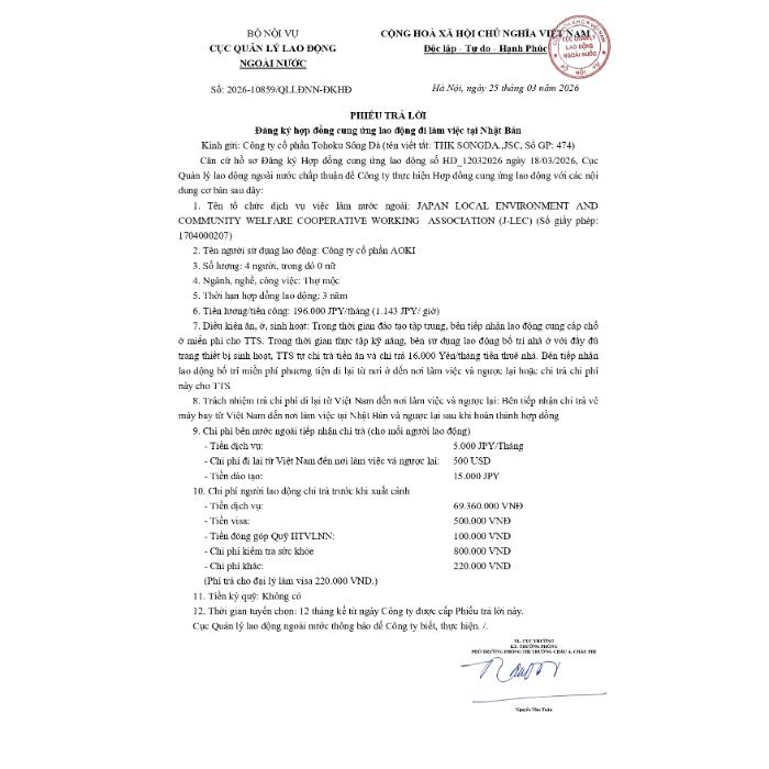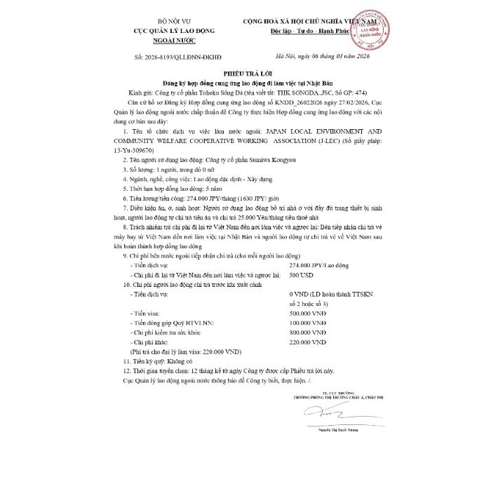 HỢP ĐỒNG ĐƯỢC CỤC QUẢN LÝ LAO ĐỘNG NGOÀI NƯỚC CHẤP THUẬN THÁNG 3/2026 Người đăng: Tohoku Sông Đà Công ty cổ phần - 09/03/2026 Chia sẻ: Tin tức liên quan HỢP ĐỒNG ĐƯỢC CỤC QUẢN LÝ LAO ĐỘNG NGOÀI NƯỚC CHẤP THUẬN THÁNG 4/2026 HỢP ĐỒNG ĐƯỢC CỤC QUẢN LÝ LAO ĐỘNG NGOÀI NƯỚC CHẤP THUẬN THÁNG 3/2026 HỢP ĐỒNG ĐƯỢC CỤC QUẢN LÝ LAO ĐỘNG NGOÀI NƯỚC CHẤP THUẬN THÁNG 2/2026 HỢP ĐỒNG ĐƯỢC CỤC QUẢN LÝ LAO ĐỘNG NGOÀI NƯỚC CHẤP THUẬN THÁNG 12/2025 HỢP ĐỒNG ĐƯỢC CỤC QUẢN LÝ LAO ĐỘNG NGOÀI NƯỚC CHẤP THUẬN THÁNG 11/2025