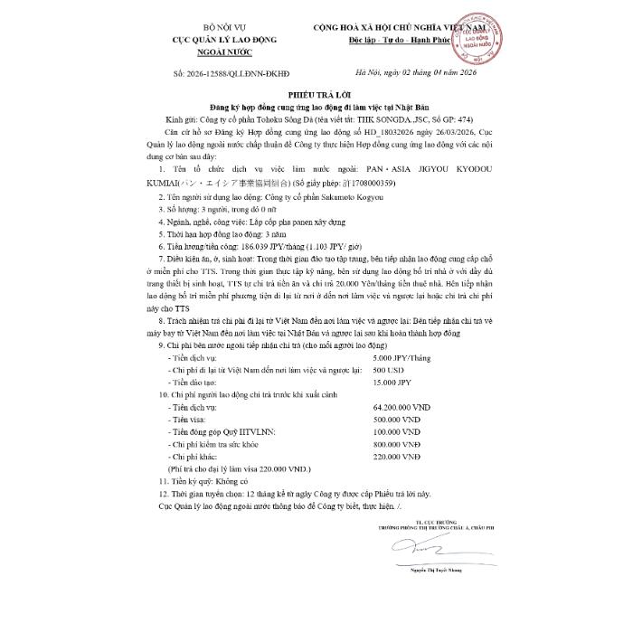 HỢP ĐỒNG ĐƯỢC CỤC QUẢN LÝ LAO ĐỘNG NGOÀI NƯỚC CHẤP THUẬN THÁNG 4/2026 Người đăng: Tohoku Sông Đà Công ty cổ phần - 09/04/2026 Chia sẻ: Tin tức liên quan HỢP ĐỒNG ĐƯỢC CỤC QUẢN LÝ LAO ĐỘNG NGOÀI NƯỚC CHẤP THUẬN THÁNG 4/2026 HỢP ĐỒNG ĐƯỢC CỤC QUẢN LÝ LAO ĐỘNG NGOÀI NƯỚC CHẤP THUẬN THÁNG 3/2026 HỢP ĐỒNG ĐƯỢC CỤC QUẢN LÝ LAO ĐỘNG NGOÀI NƯỚC CHẤP THUẬN THÁNG 2/2026 HỢP ĐỒNG ĐƯỢC CỤC QUẢN LÝ LAO ĐỘNG NGOÀI NƯỚC CHẤP THUẬN THÁNG 12/2025 HỢP ĐỒNG ĐƯỢC CỤC QUẢN LÝ LAO ĐỘNG NGOÀI NƯỚC CHẤP THUẬN THÁNG 11/2025