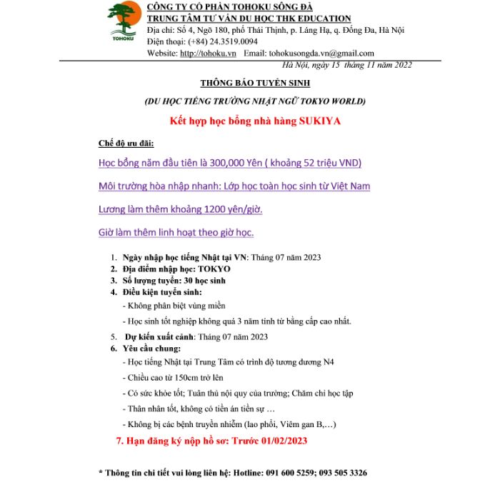 Học bổng trường Nhật ngữ TOKYO WORLD kết hợp nhà hàng SUKYIA thì tương đối gần gũi hơn với hình dung phổ biến về Du học sinh vừa học, vừa làm. Bạn sẽ được gì: vừa đỗ học bổng 300,000 Yên ( chính là bạn tự kiếm ra tiền đó- tuyệt chưa ), có lương làm thêm ( tương đối đủ cho phí sinh hoạt tháng của bạn ) bạn được sắp xếp bố trí nơi làm việc ngay khi sang Nhật phù hợp với lịch học và quan trọng hơn : Phù hợp với trình độ tiếng Nhật khi bạn vừa chân ướt chân ráo xuống máy bay ( điều này những bạn tự đi tìm việc biết khá rõ đấy: kiếm được việc ổn định khi tiếng chưa giỏi không phải điều dễ dàng khi số lượng Du học sinh ở Nhật khá đông ( thứ 2 sau Trung Quốc ).