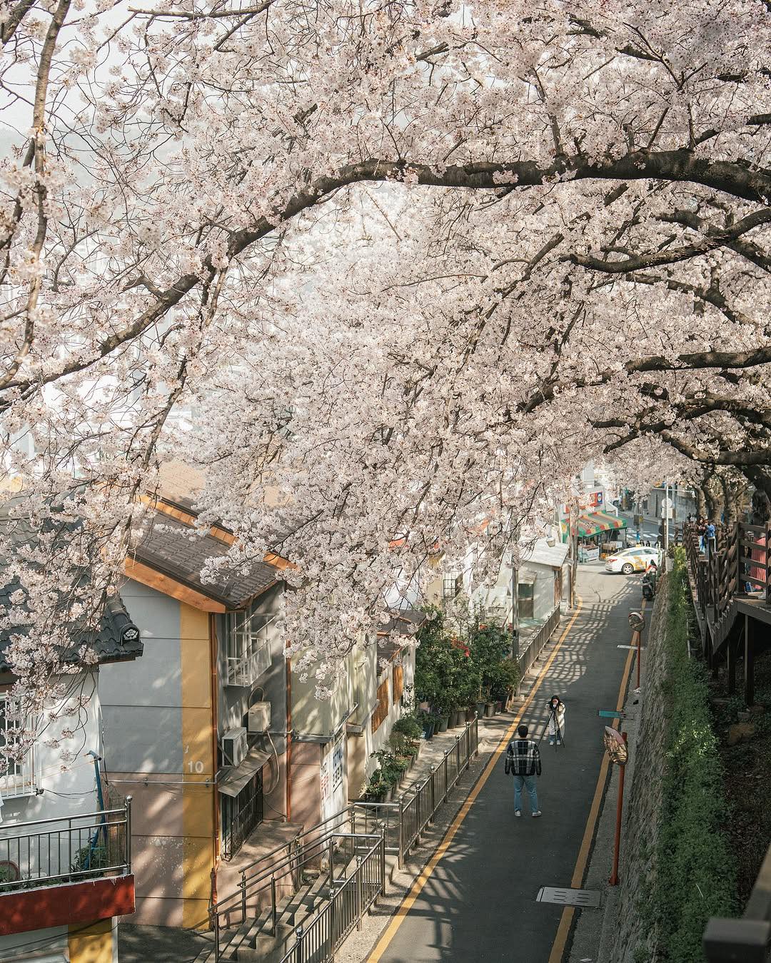 Con đường văn hóa hoa anh đào Gaegeum-dong chính là tọa độ ngắm anh đào lý tưởng đầu tiên du khách không nên bỏ qua khi dừng chân tại thành phố Busan. Con đường nổi tiếng này nằm trên một con dốc cao với những dãy nhà cổ kính, tuy không quá náo nhiệt nhưng lại có thể quan sát được toàn cảnh thành phố cảng mộng mơ này.