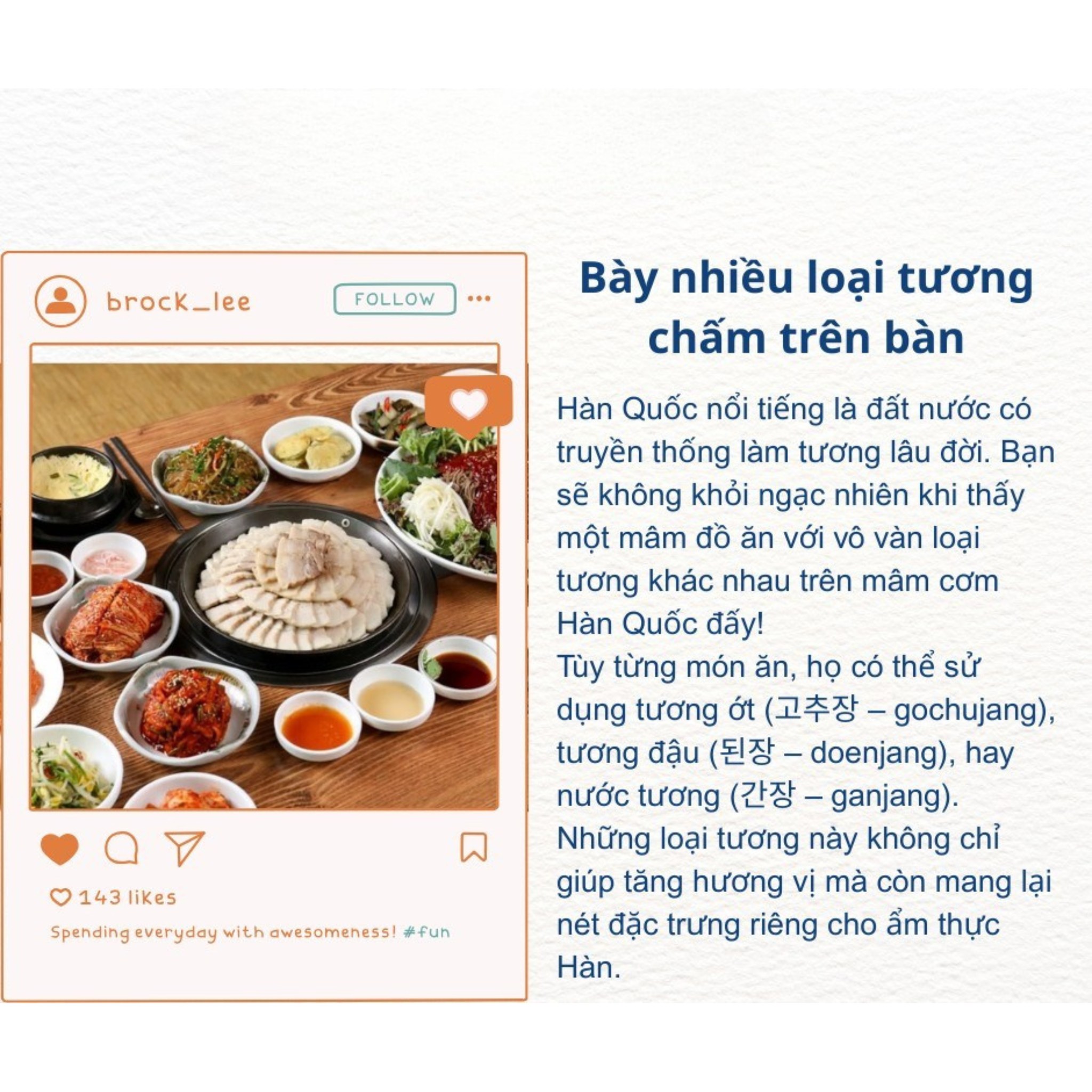 Không chỉ đóng vai trò là gia vị, các loại tương này còn góp phần tạo nên bản sắc riêng của từng vùng miền Hàn Quốc. Mỗi món ăn khi kết hợp đúng loại tương sẽ trở nên tròn vị, hấp dẫn và đúng “chuẩn Hàn”.