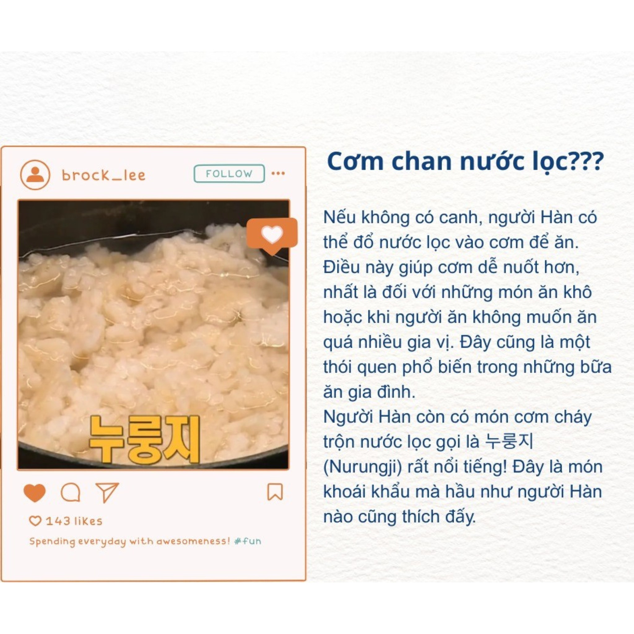 Ngoài ra, một món ăn truyền thống mà người Hàn cực kỳ yêu thích là cơm cháy trộn nước lọc – Nurungji (누룽지). Sau khi nấu cơm, phần đáy nồi thường có lớp cháy giòn thơm, người ta sẽ đổ nước nóng vào để tạo thành một món ăn dân dã, ngon miệng, rất được ưa chuộng vào bữa sáng hoặc bữa phụ.
