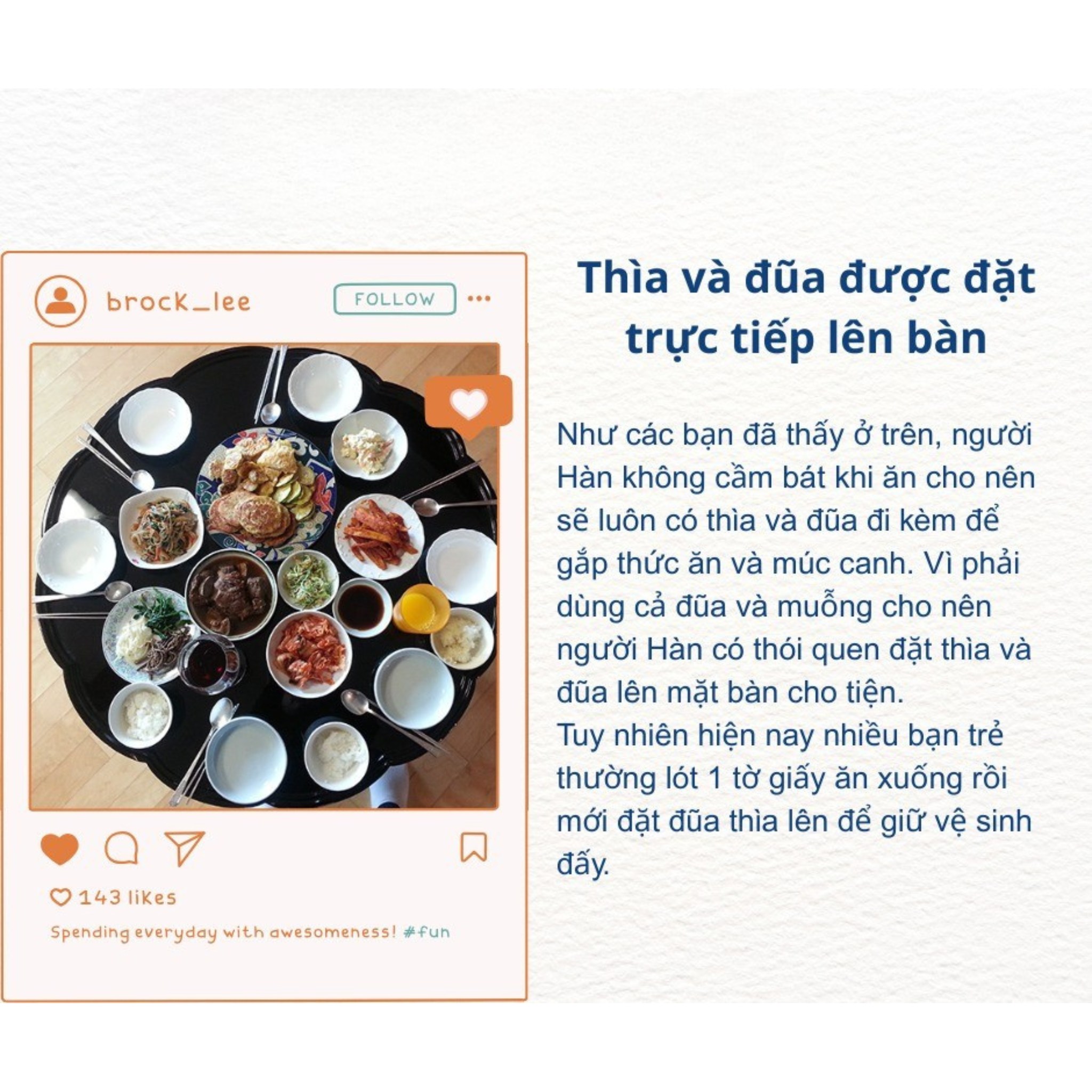 Tuy nhiên, giới trẻ Hàn Quốc ngày nay cũng rất chú trọng đến vệ sinh. Nhiều bạn thường lót giấy ăn bên dưới trước khi đặt thìa và đũa để đảm bảo sạch sẽ hơn – một thói quen rất đáng học hỏi.