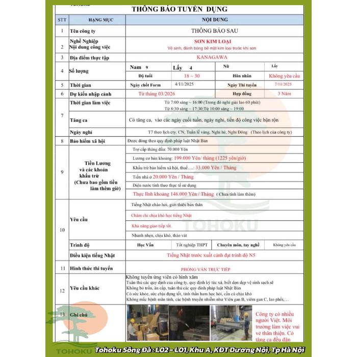 Công ty Cổ phần Tohoku xin thông báo tuyển dụng đơn hàng Sơn Kim Loại tại tỉnh Kanagawa, lịch phỏng vấn vào Thứ 6, ngày 07/11/2025. Thông tin chi tiết như sau: