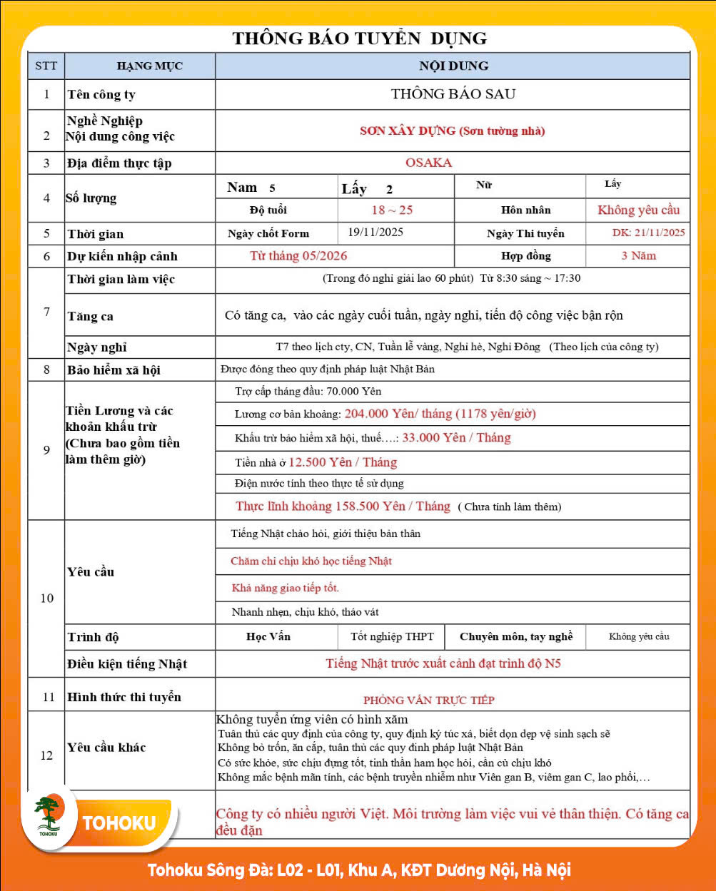 TUYỂN DỤNG ĐƠN HÀNG: SƠN XÂY DỰNG (NAM)- OSAKA