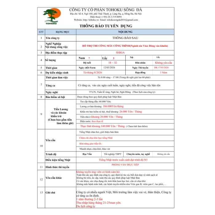 - Thu nhập thực lĩnh: có thể lên tới 250.000 Yên/tháng
