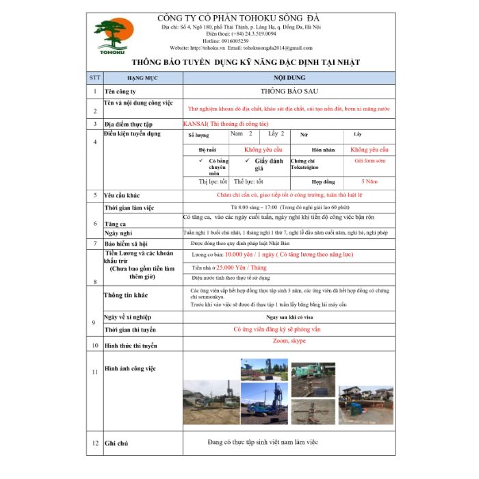 Công ty Cổ phần Tohoku Sông Đà xin thông báo tuyển dụng các đơn hàng Kỹ năng đặc định Nhật Bản phỏng vấn trong năm 2021 và 2022 như sau: