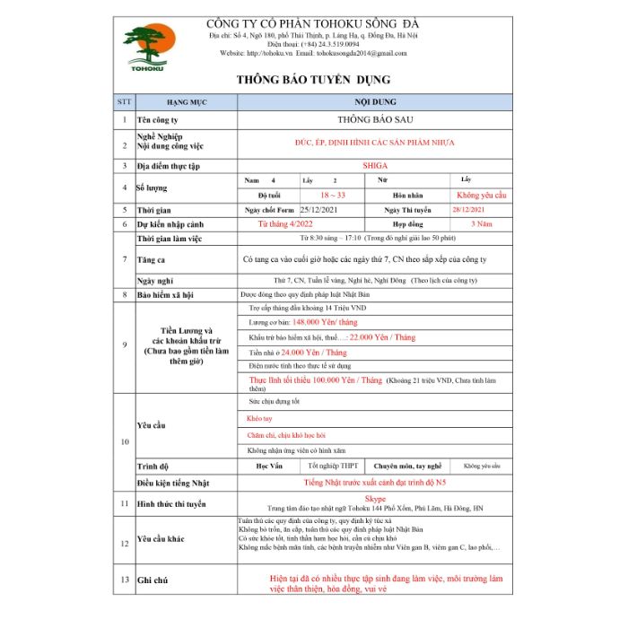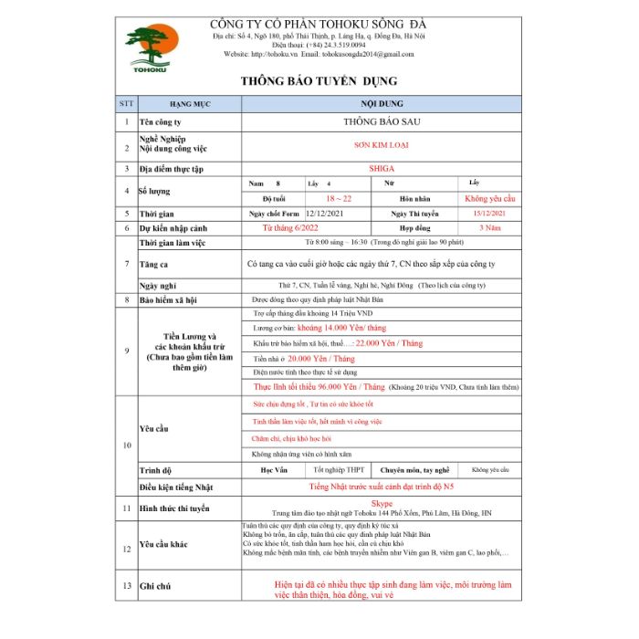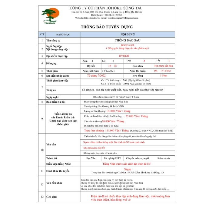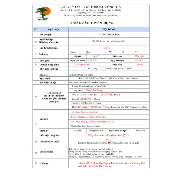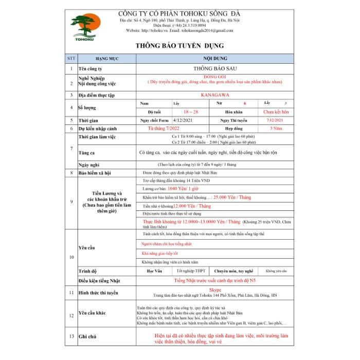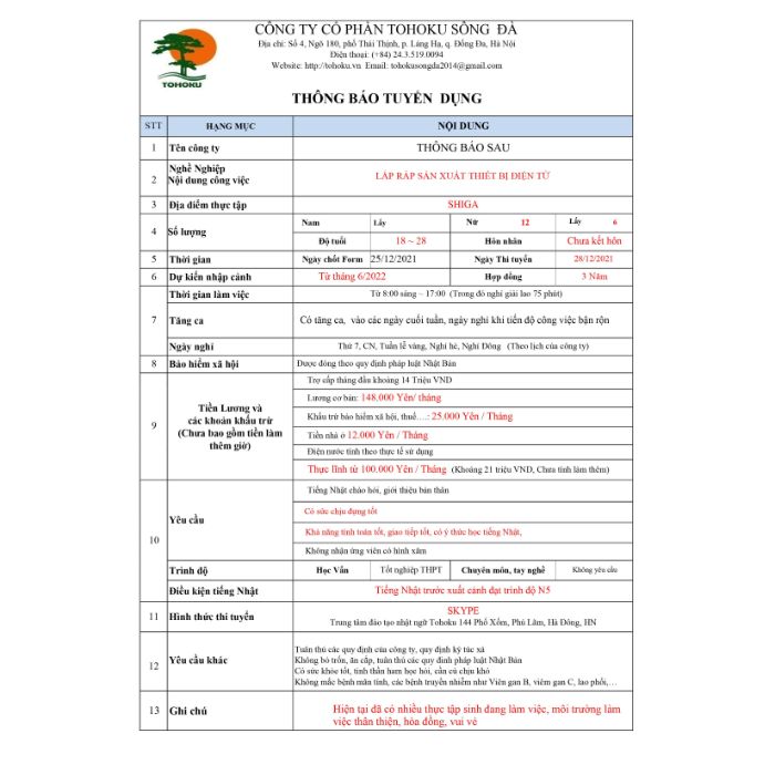 THÔNG BÁO TUYỂN DỤNG CÁC ĐƠN HÀNG THỰC TẬP SINH NHẬT BẢN PHỎNG VẤN TRONG THÁNG 12/2021 CỦA CÔNG TY CỔ PHẦN TOHOKU SÔNG ĐÀ