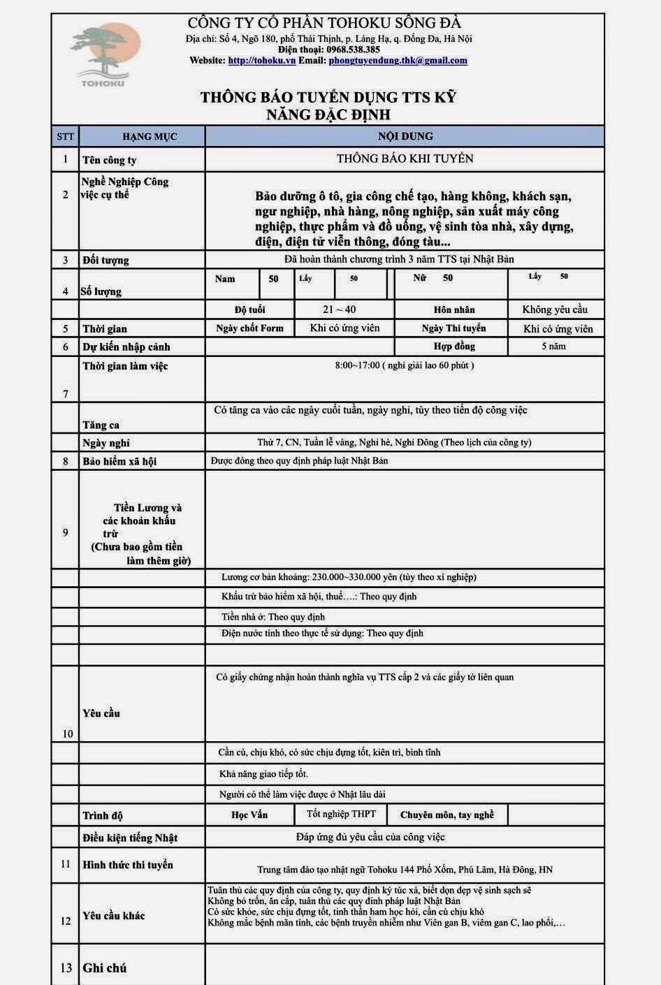 Công ty Cổ phần Tohoku Sông Đà xin thông báo tuyển dụng chương trình Thực tập sinh kỹ năng đặc định các đơn hàng dành cho Nam và Nữ như sau: Bảo dưỡng ô tô, gia công chế tạo, hàng không, khách sạn, ngư nghiệp, nhà hàng, nông nghiệp, sản xuất máy công nghiệp, thực phẩm và đồ uống, vệ sinh tòa nhà, xây dựng, điện, điện tử viễn thông, đóng tàu,...Độ tuổi từ 21~40 tuổi. Hợp đồng: 05 năm. Lương cơ bản: 230.000 ~ 330.000 yên (tùy theo xí nghiệp). Thông tin chi tiết về thông báo tuyển dụng vui lòng tham khảo thông tin bên dưới: