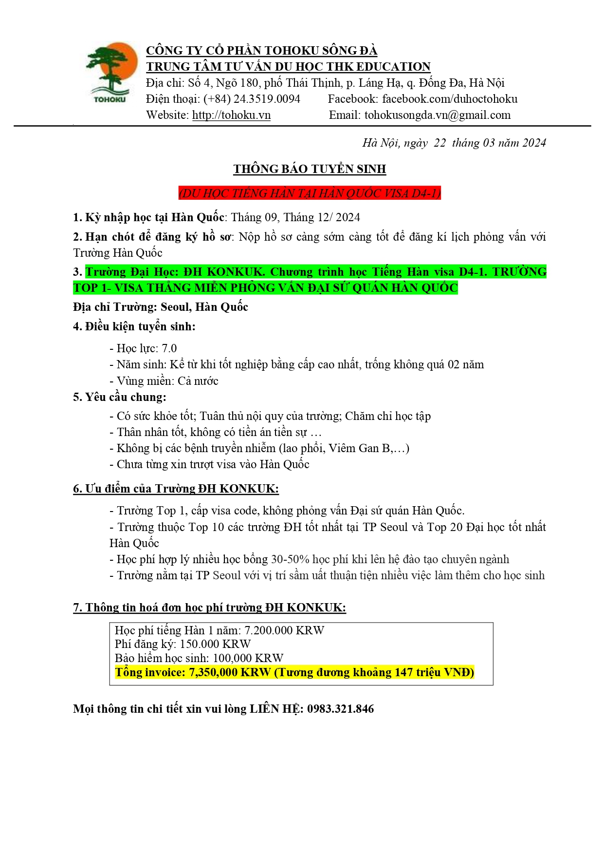 Các bạn có nhu cầu du học trường Đại Học Konkuk xin vui lòng liên hệ Trung tâm Tư vấn du học THK Education (Trực thuộc Công ty Cổ phần Tohoku Sông Đà).