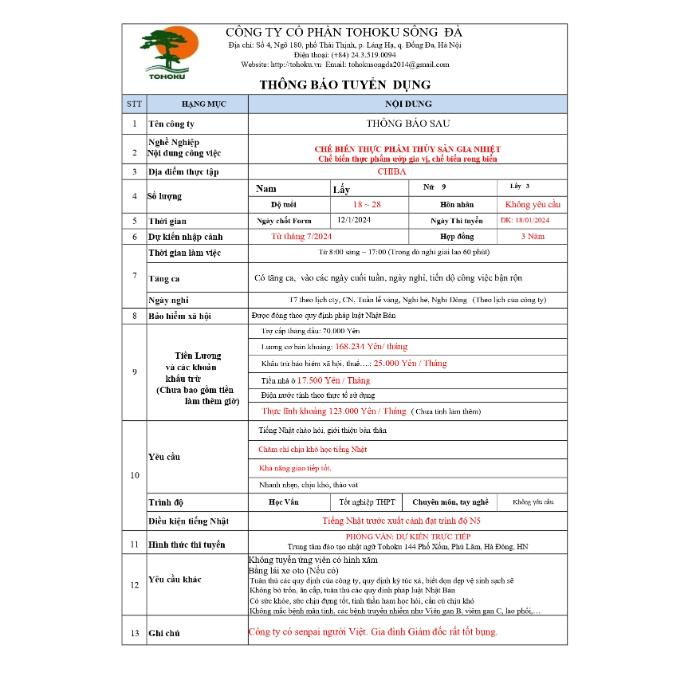 Công ty có nhiều thực tập sinh đang làm việc tại đây. Chế độ đãi ngộ tốt, công việc ổn định. Hãy gọi cho chúng tôi để biết thêm chi tiết và đăng ký thi tuyển đúng hạn nhé.