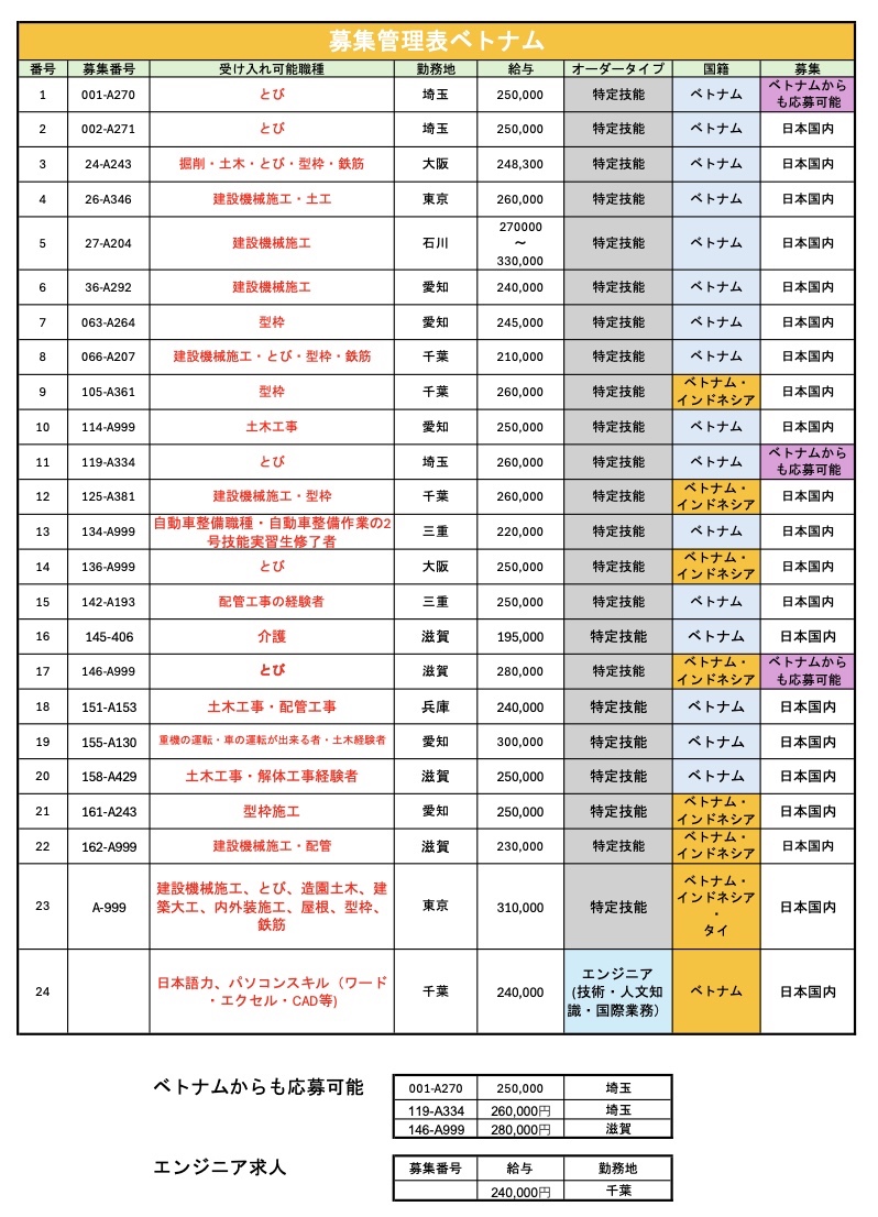 Trong số các ngành nghề, Xây dựng (建設業) hiện là lĩnh vực có nhu cầu tuyển dụng lớn, trải dài tại nhiều tỉnh thành như Tokyo, Osaka, Aichi, Saitama, Chiba, Hyogo, Shiga, Ishikawa, Mie…