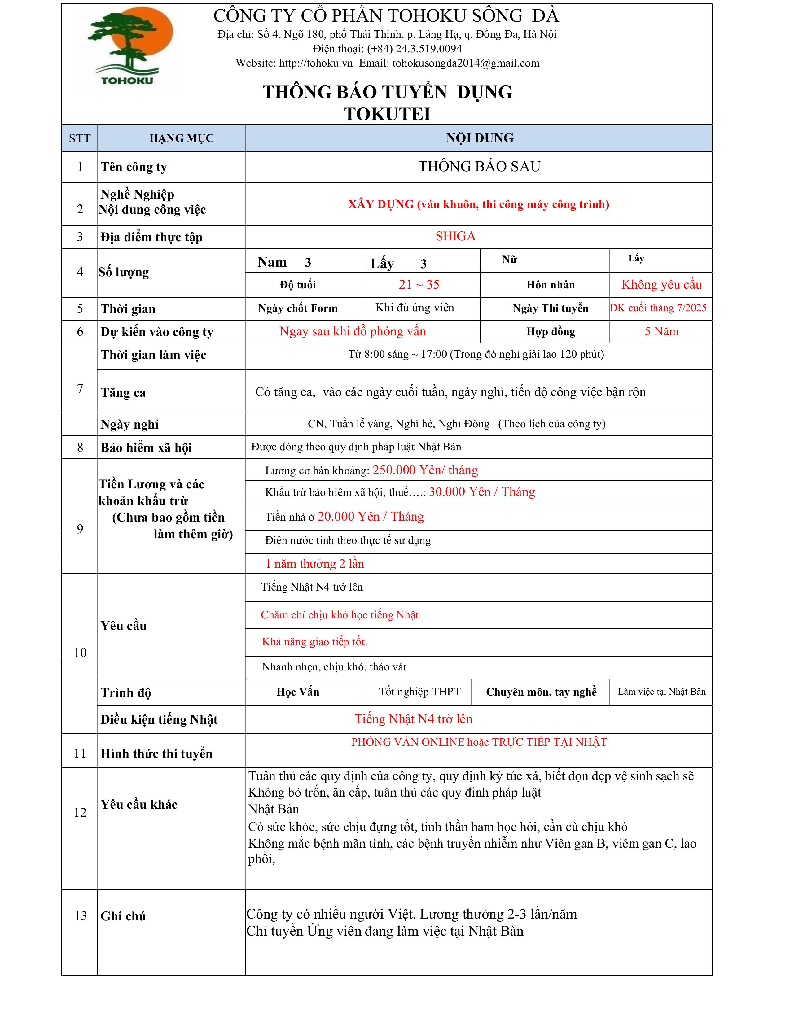 Lương cơ bản: 250.000 Yên/tháng (chưa tính tăng ca)