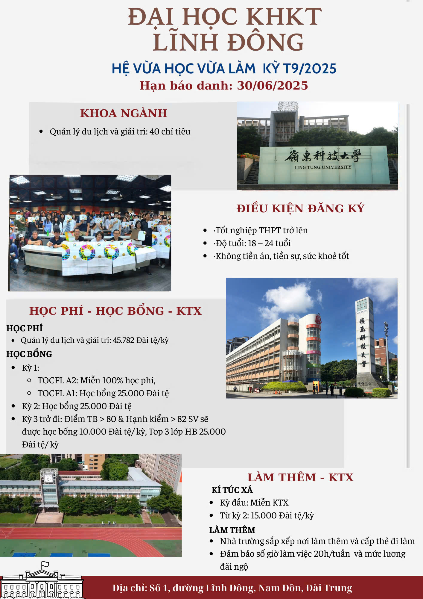 Đại học KHKT Lĩnh Đông – một trong những trường tư thục uy tín tại Đài Trung – chính là điểm đến lý tưởng cho du học sinh Việt Nam. Với chương trình đào tạo gắn liền với nhu cầu doanh nghiệp, đội ngũ giảng viên giàu kinh nghiệm và môi trường học tập chuẩn quốc tế, Lĩnh Đông không chỉ là nơi học tập mà còn là bước đệm vững chắc cho sự nghiệp tương lai của bạn.
