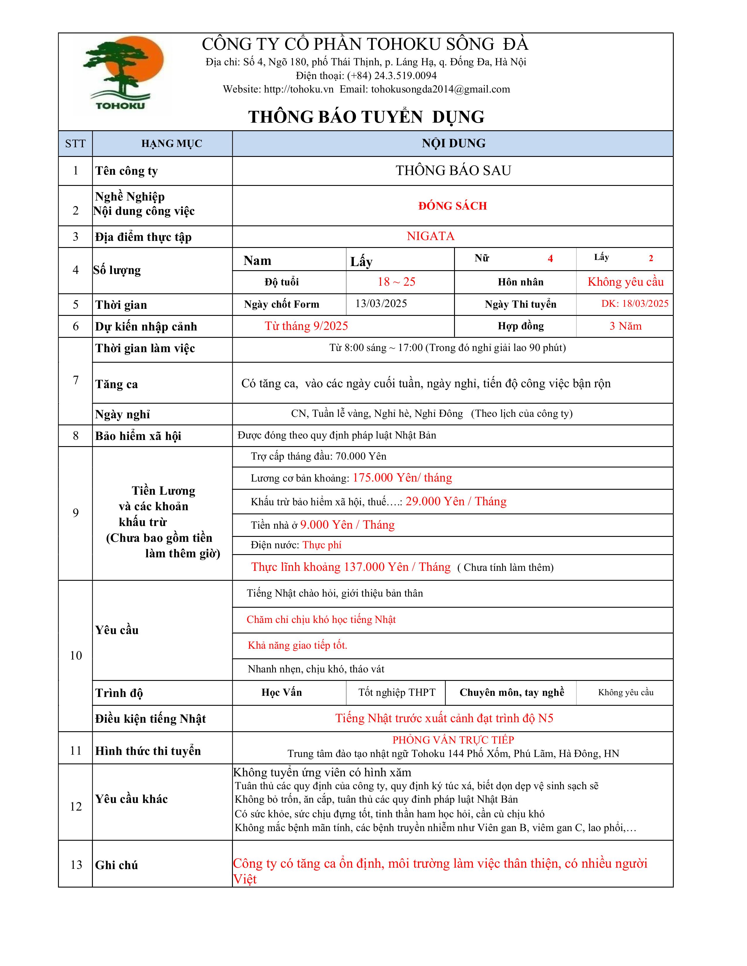 CÔNG TY CỔ PHẦN TOHOKU SÔNG ĐÀ