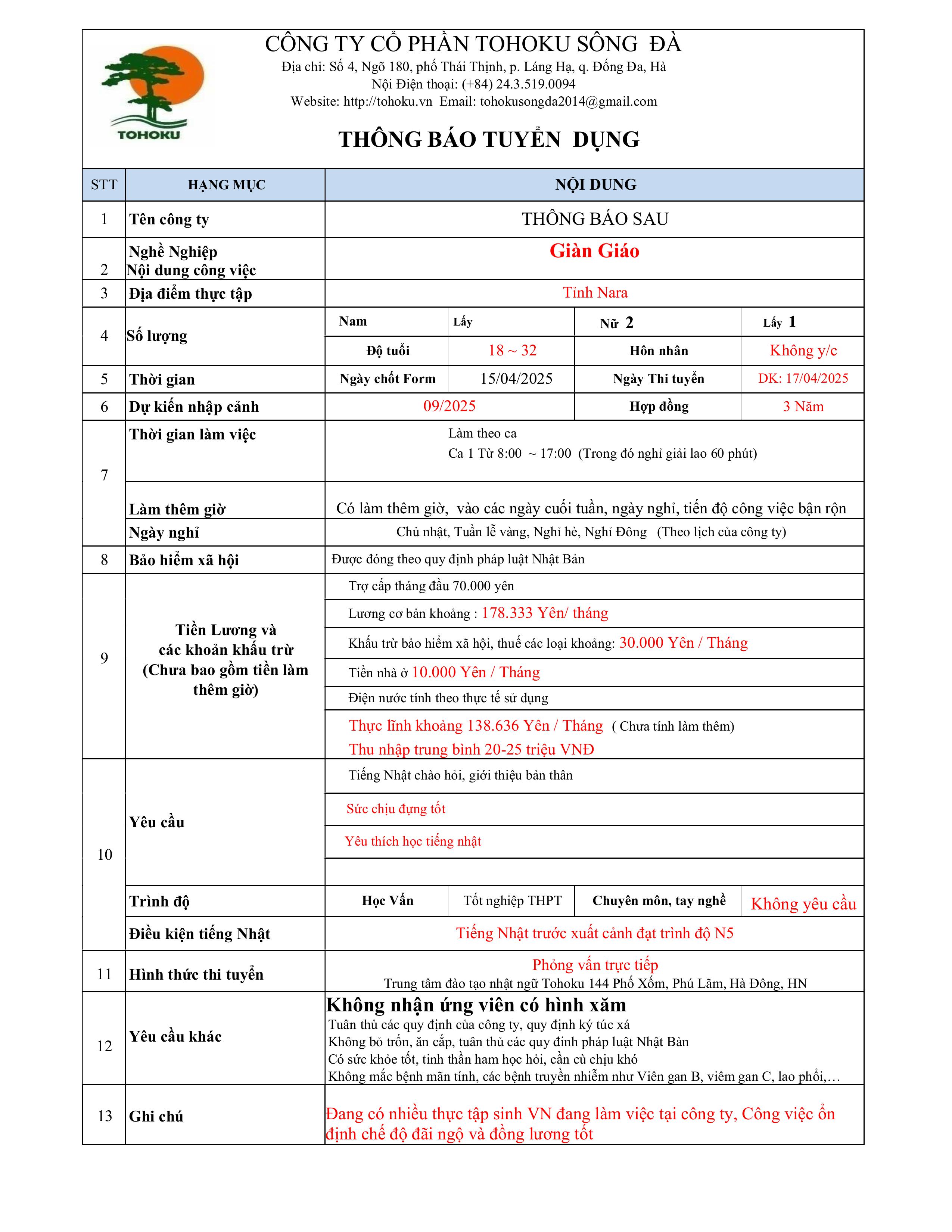 Là ngành nghề thuộc lĩnh vực xây dựng, đơn hàng giàn giáo tại Nhật Bản hiện có nhu cầu tuyển dụng cao, đặc biệt tại các khu vực có tốc độ đô thị hóa mạnh. Đây là công việc phù hợp với lao động nam, yêu thích môi trường làm việc năng động và có thu nhập tốt.