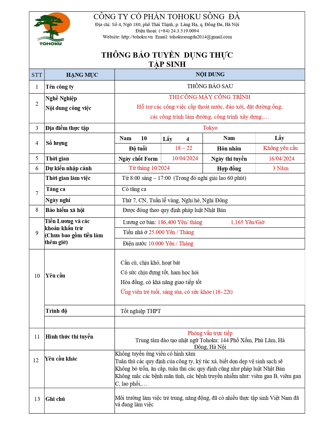 CÔNG TY CỔ PHẦN TOHOKU SÔNG ĐÀ